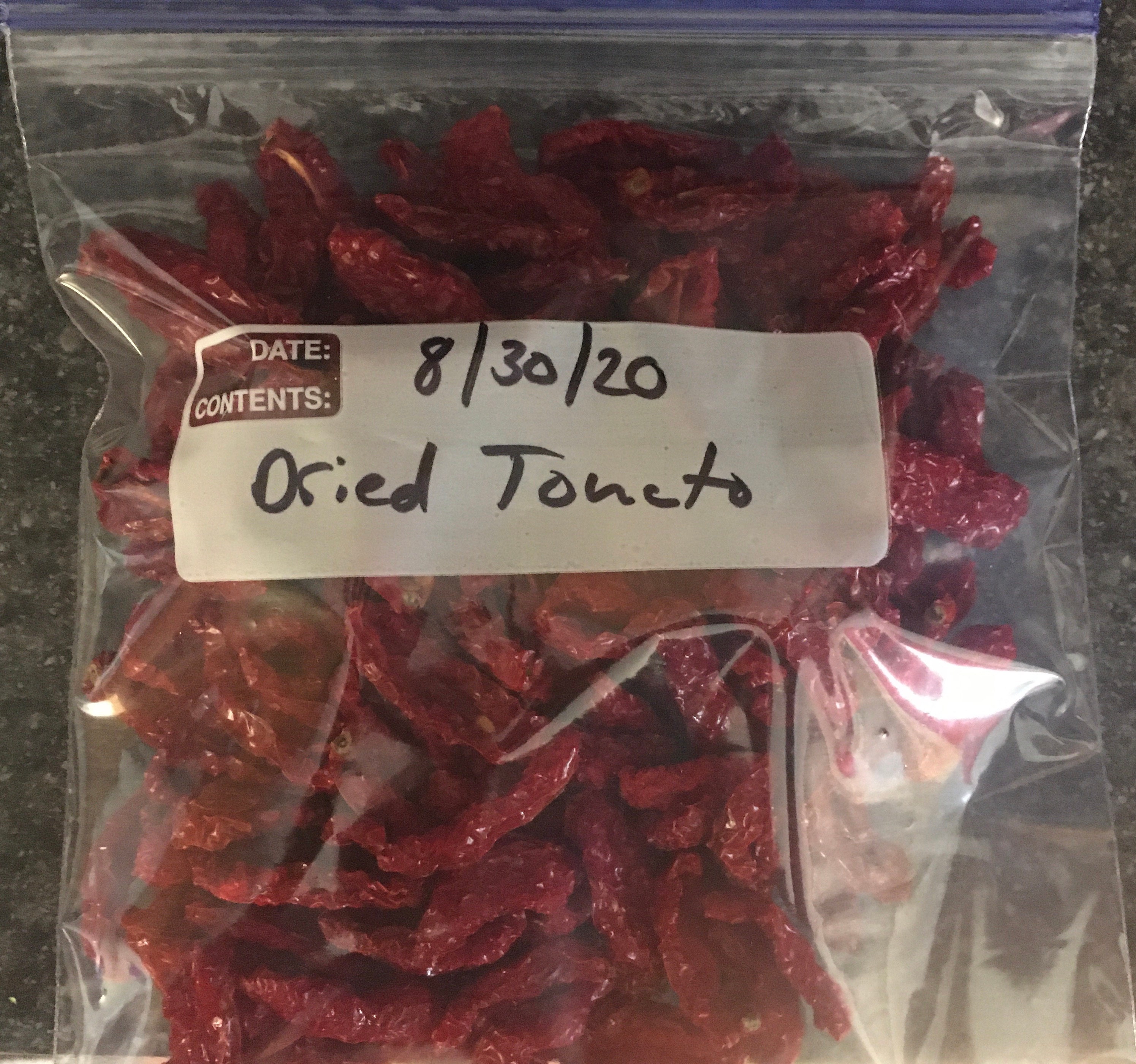 Your ultimate goal is potato chip crispness. The whole process reduced the tomatoes from 4# to less than 4 ounces. I then labelled and dated a quart size freezer bag, put the dried tomatoes into it, sealed it and put the bag in the freezer. As you can see, there's plenty of room for more...probably a double batch.