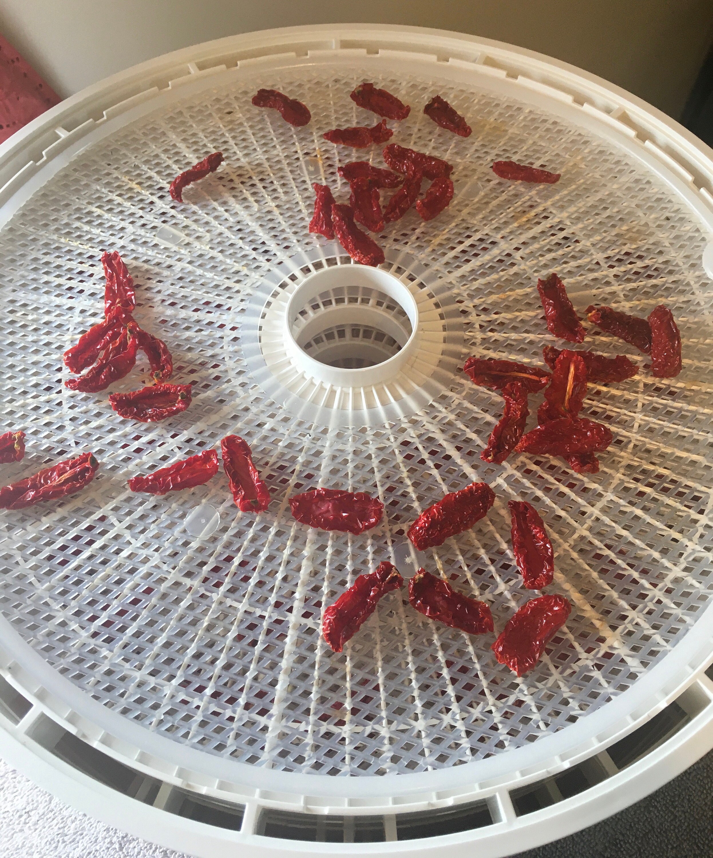 I also experimented with drying some poblano peppers. It worked well too, but my take away lesson here was... when drying any kind of spicy or hot peppers, do not keep the dehydrator in your house! I was choking on pepper fumes until I realized what was happening. The peppers dried much faster than the tomatoes too (~12 hours).