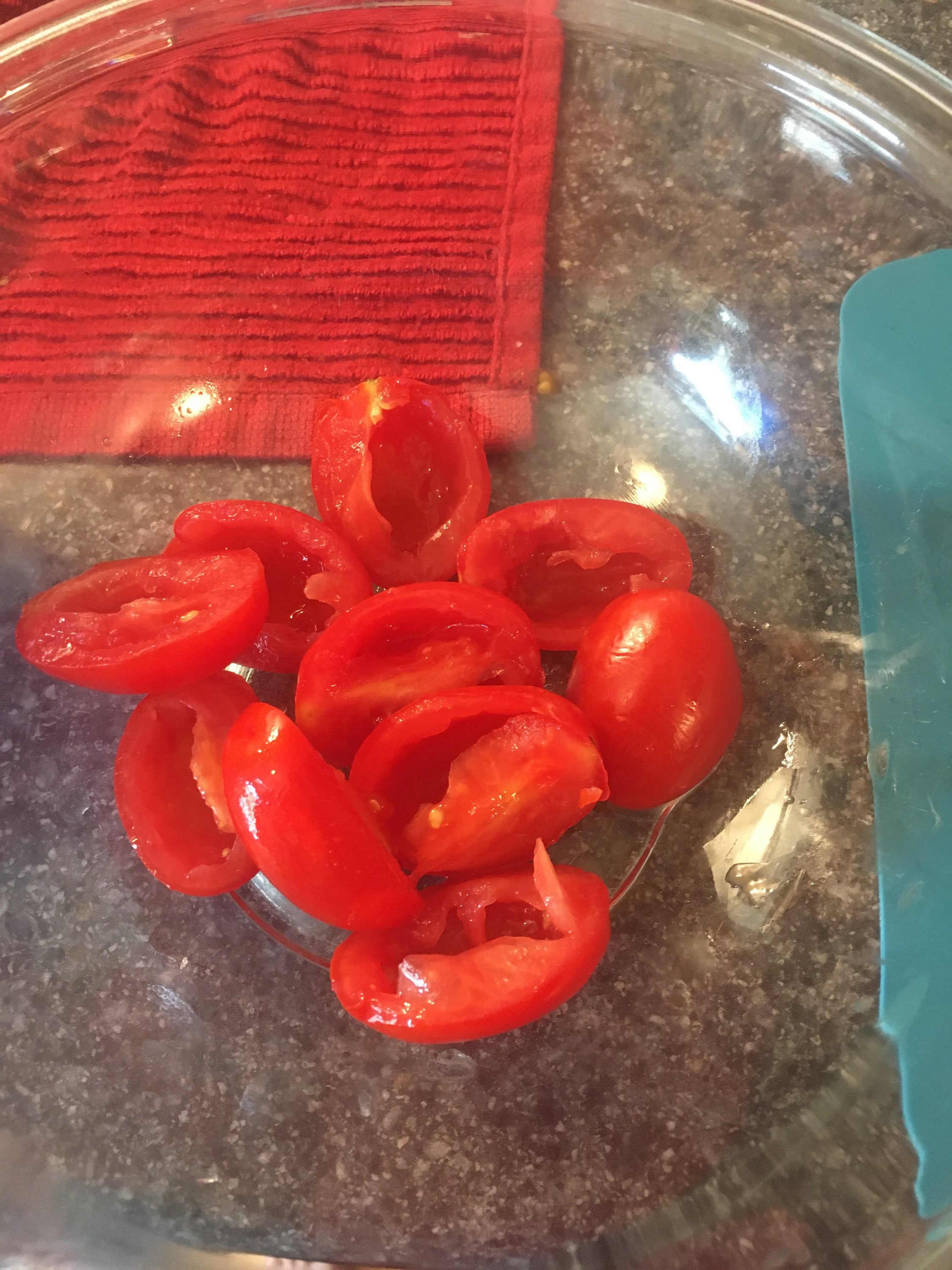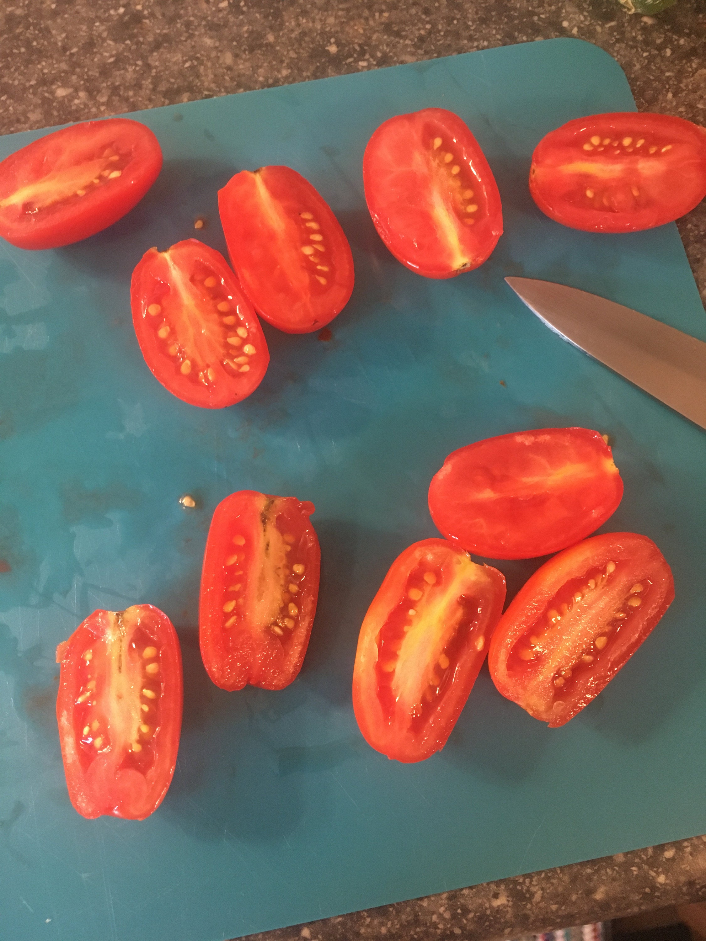 Then, I sliced each in half and scooped out the seeds. I cut off any bad spots I found.