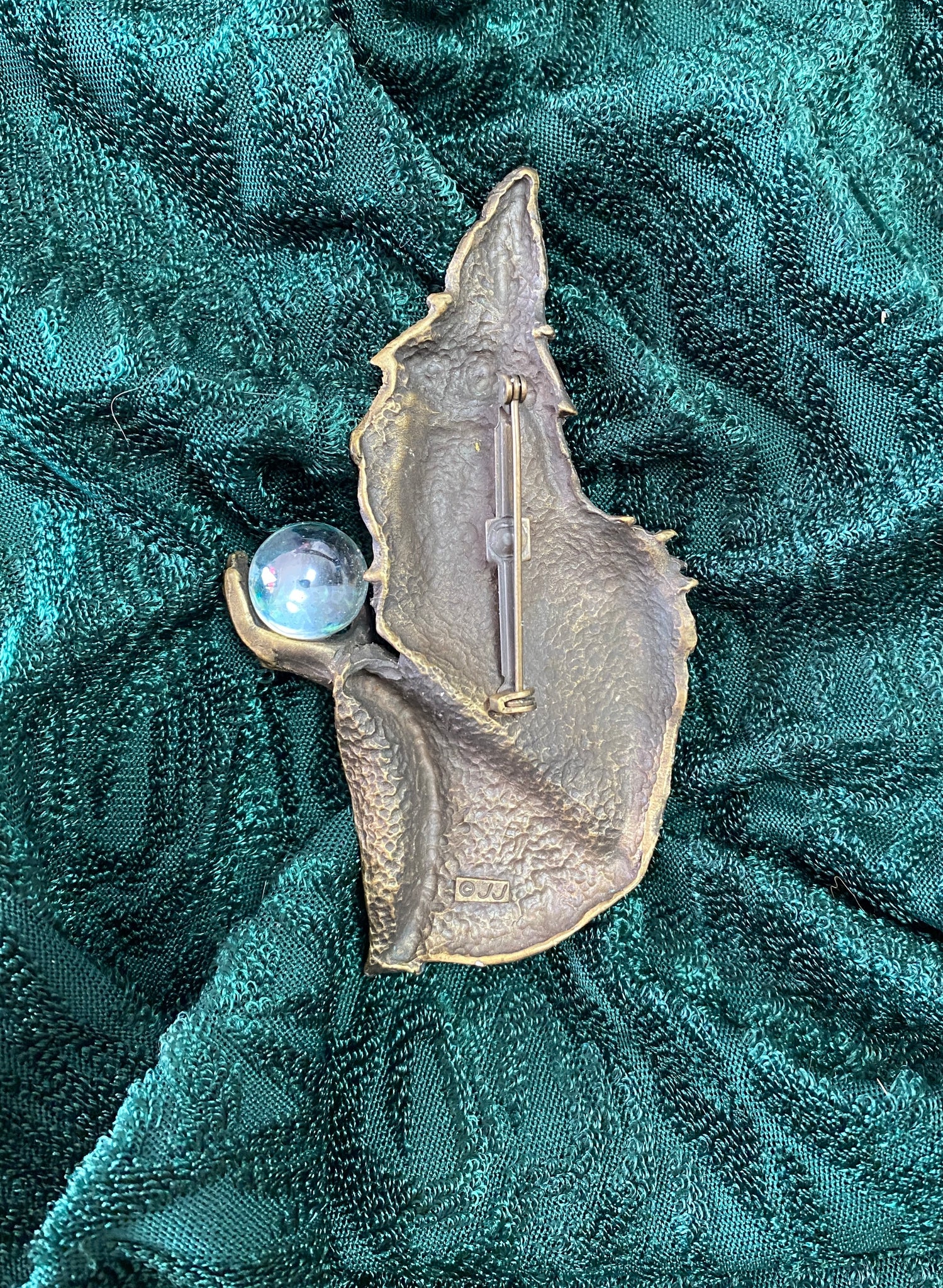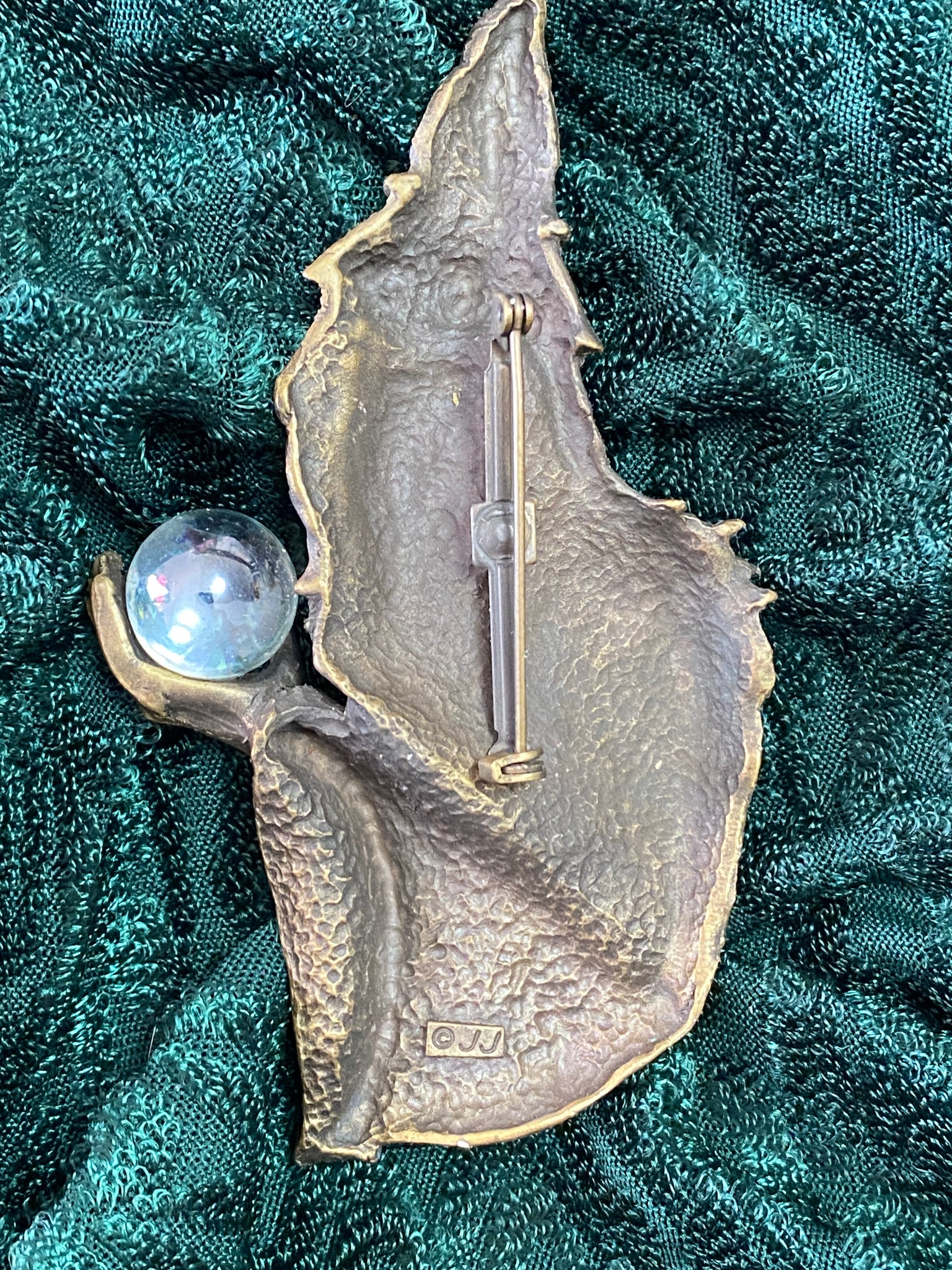 This is a large pin from the 1980s that shows a wizard (some call him Merlin) gazing into his crystal ball. There are 7 tiny rhinestones on his hat along with an iridescent half sphere cabochon. The details on this are fantastic. The pin was made in either pewter or this bronze type. There are a lot more of the silvery pewter ones available than the bronze. I had a machinist, who has worked with lots of metals, look at this pin and he told me it is not plated pewter, but cast bronze or brass